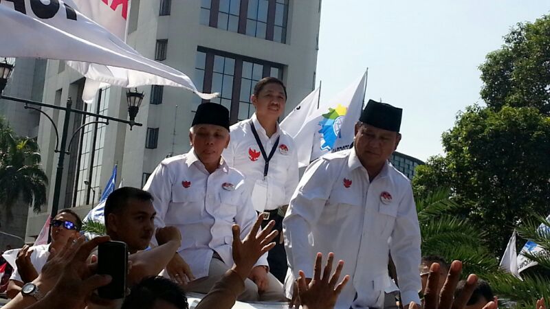 JAKARTA — Nomor urut satu (1) yang didapatkan pasangan capres dan cawapres Prabowo Subianto-Hatta Rajasa ditanggapi gegap gempita oleh pendukung pasangan ini. Sesaat sesudah Prabowo menarik kertas putih bertuliskan angka 1 dari gulungan batik yang disediakan KPU, seluruh pendukung yang terdiri dari koalisi parpol pendukung pasangan tersebut menyambut dengan teriakan ‘Kemenangan’.